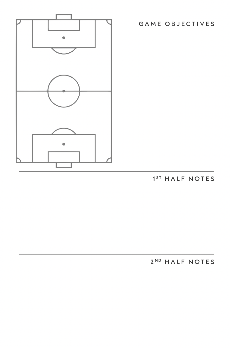 A thin 4" x 6", softcover notebook featuring 11 pages for Match Reports. Featuring Game Objectives, 1st Half Notes, and 2nd Half Notes, along with a soccer field for a quick game-day sketch.